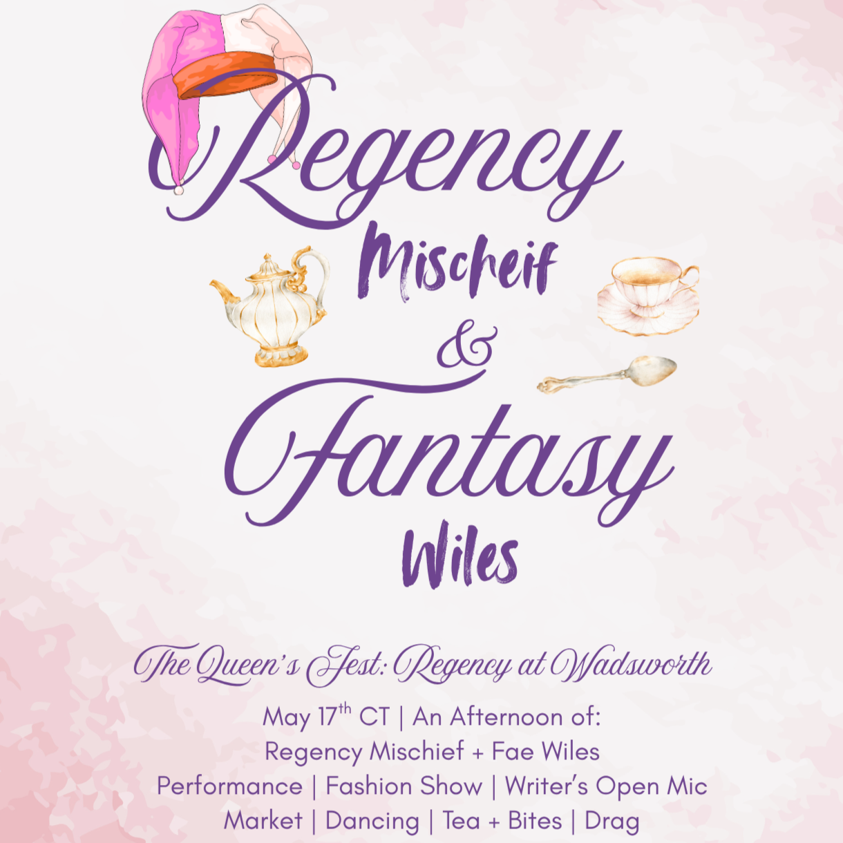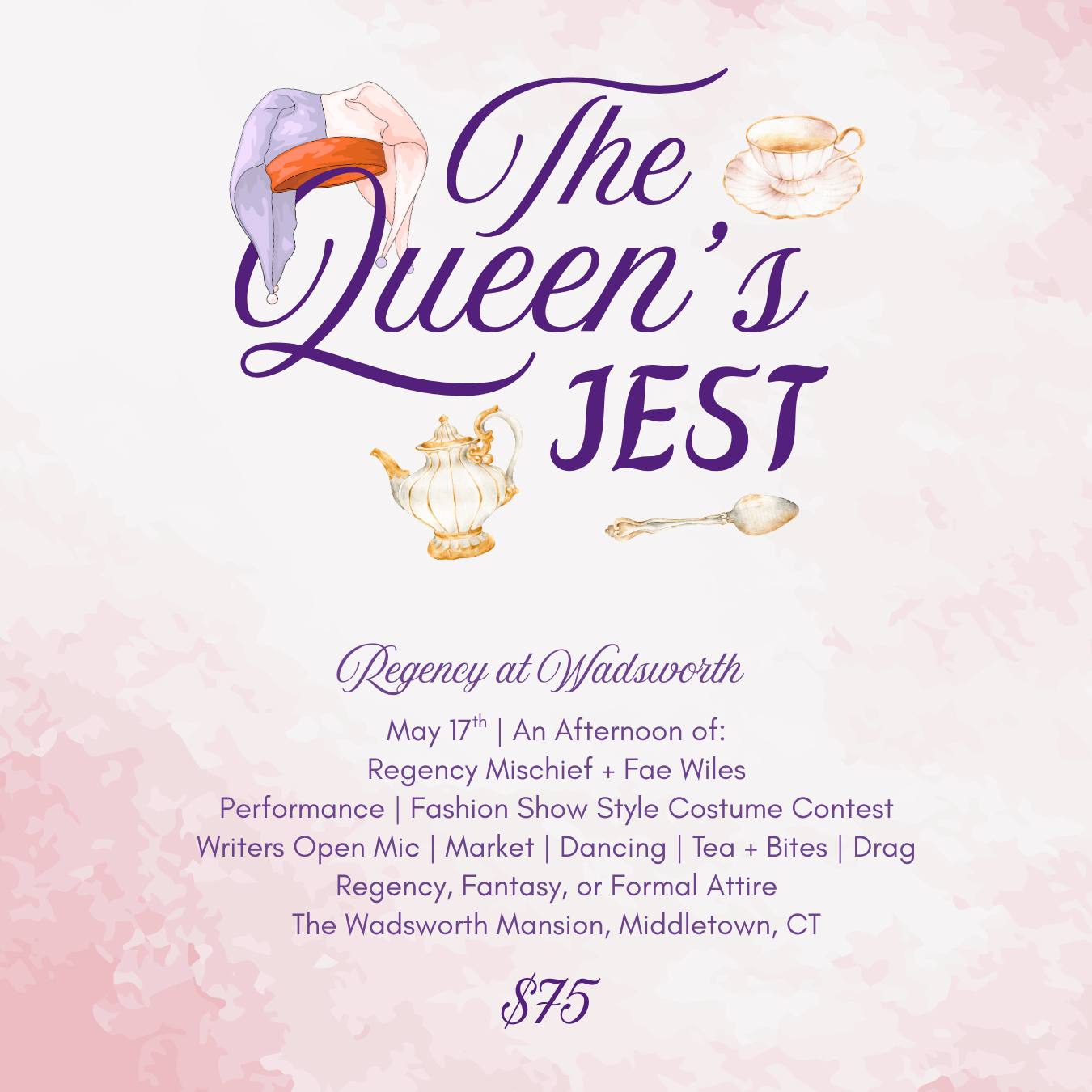 Join us for an afternoon of regency-inspired fun at The Queen's Jest on Sunday, May 17th, 2026, from 1 PM to 5 PM at the beautiful Wadsworth Mansion at Long Hill in Middletown, CT.